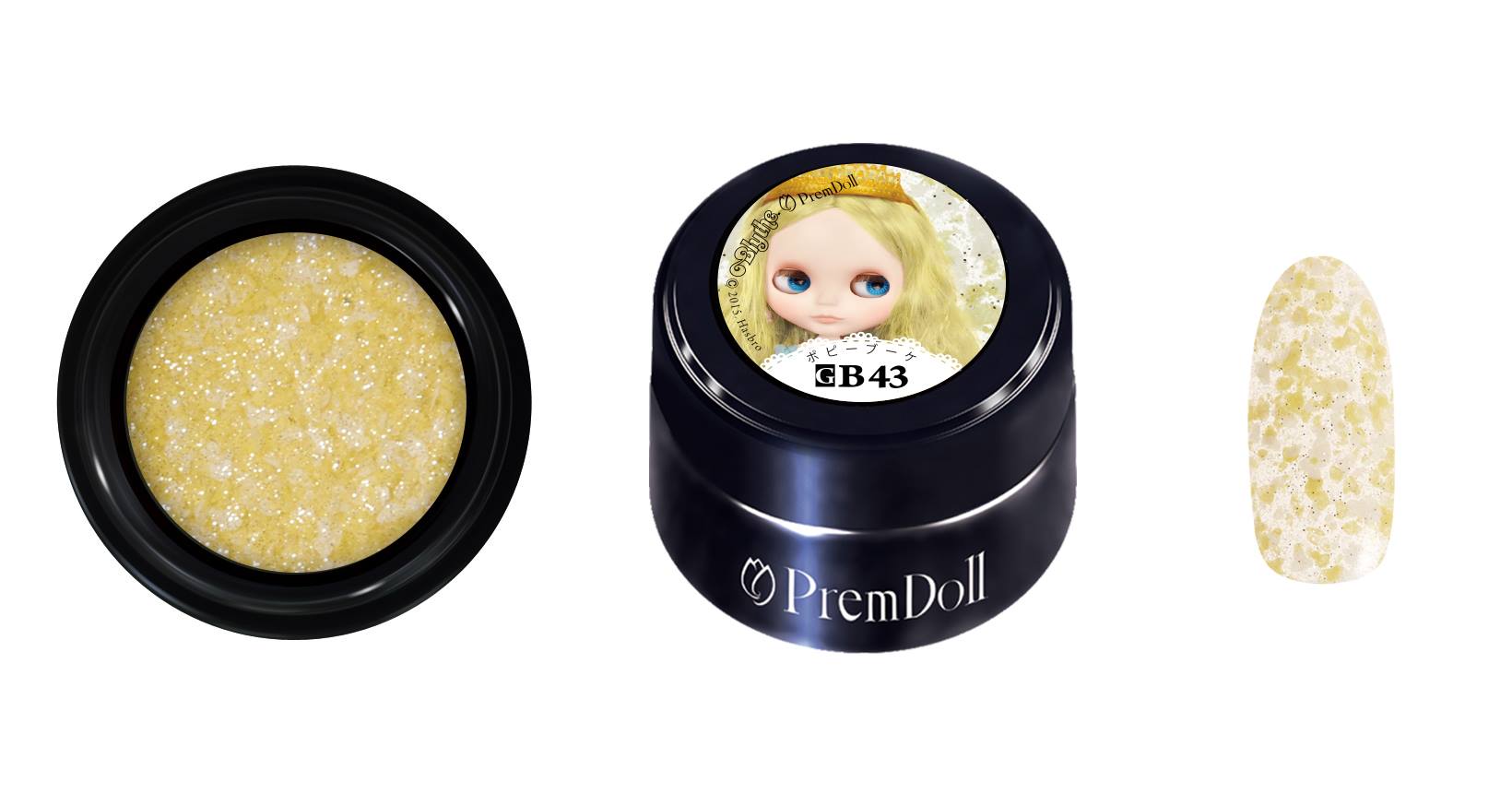 Micro silver glitter with yellow and white shell flakes in clear gel.