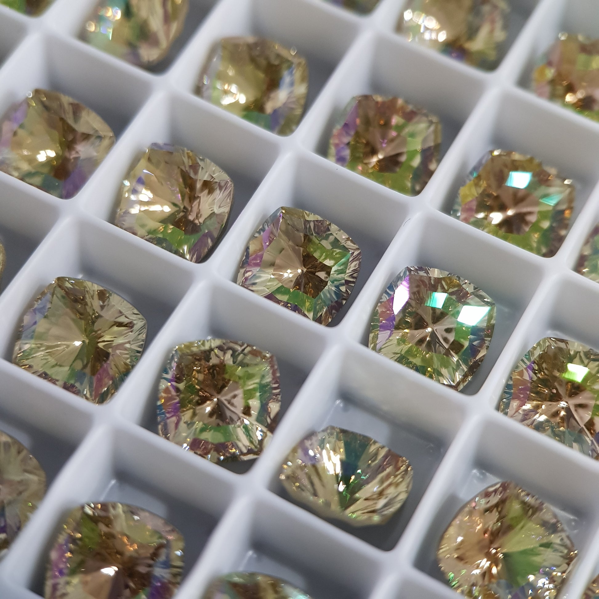 Introducing a classic cushion shape with a highly faceted look, the Mystic Square Fancy Stone captures fabulous futurism and traditional elegance in one charismatic stone. Its contemporary-precious looks are created by a grooved reverse side and precision-cut facets to the front. It makes an impressive centerpiece as well as perfectly complementing both fine jewelry and modern looks.