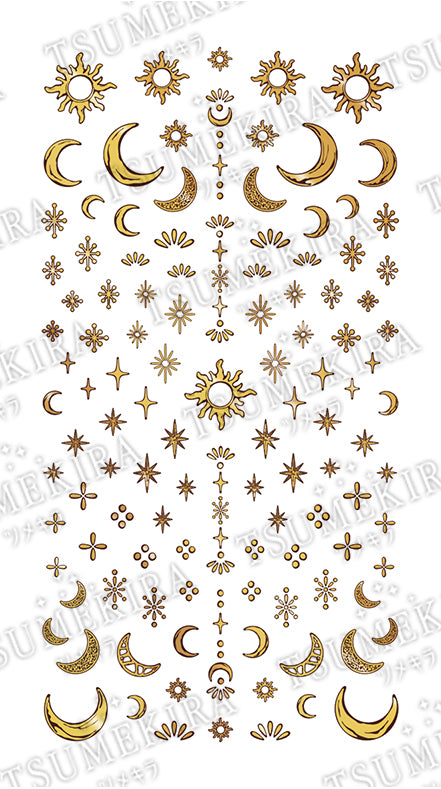 Sun and moon motifs and small glittering metal parts.