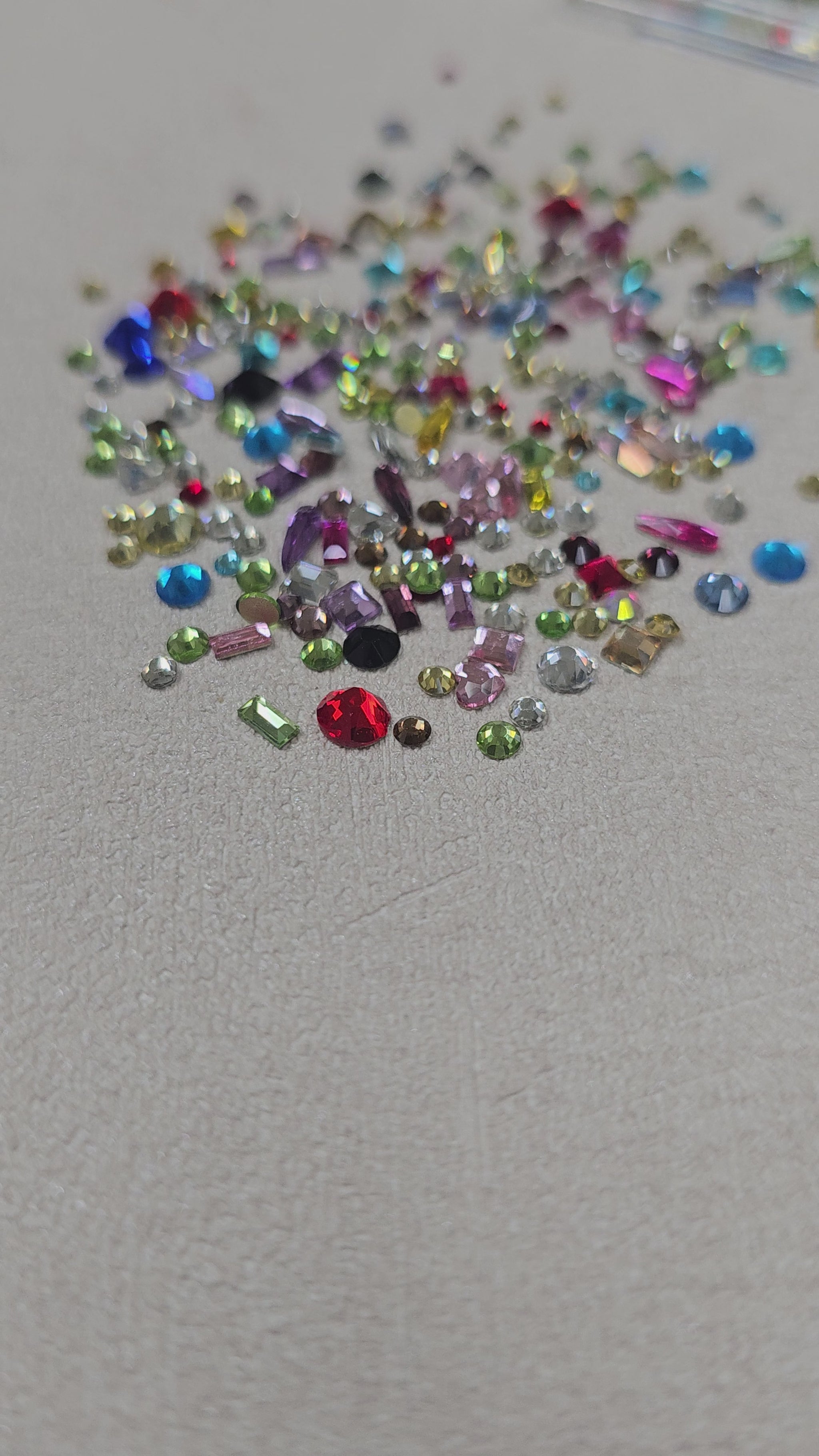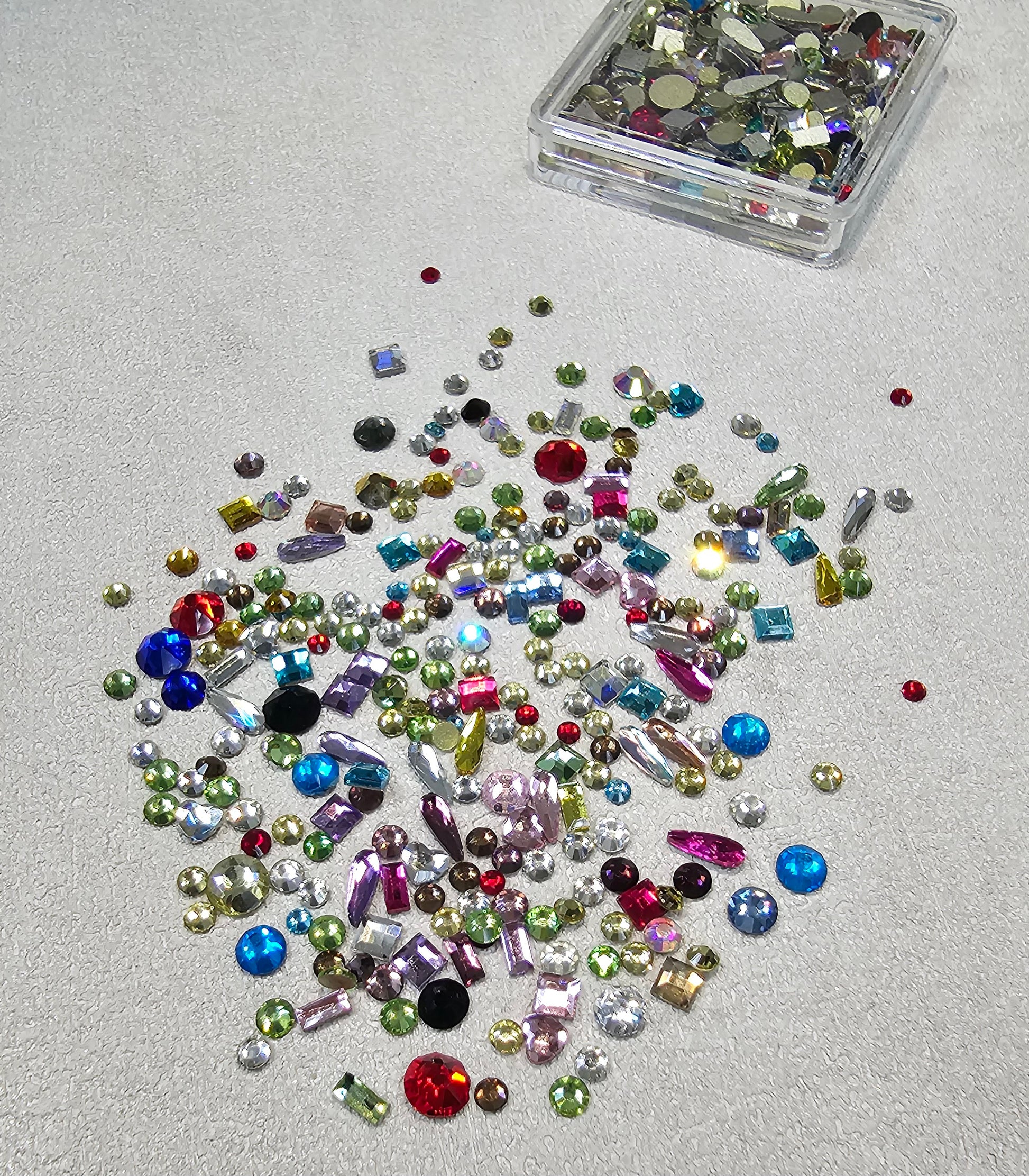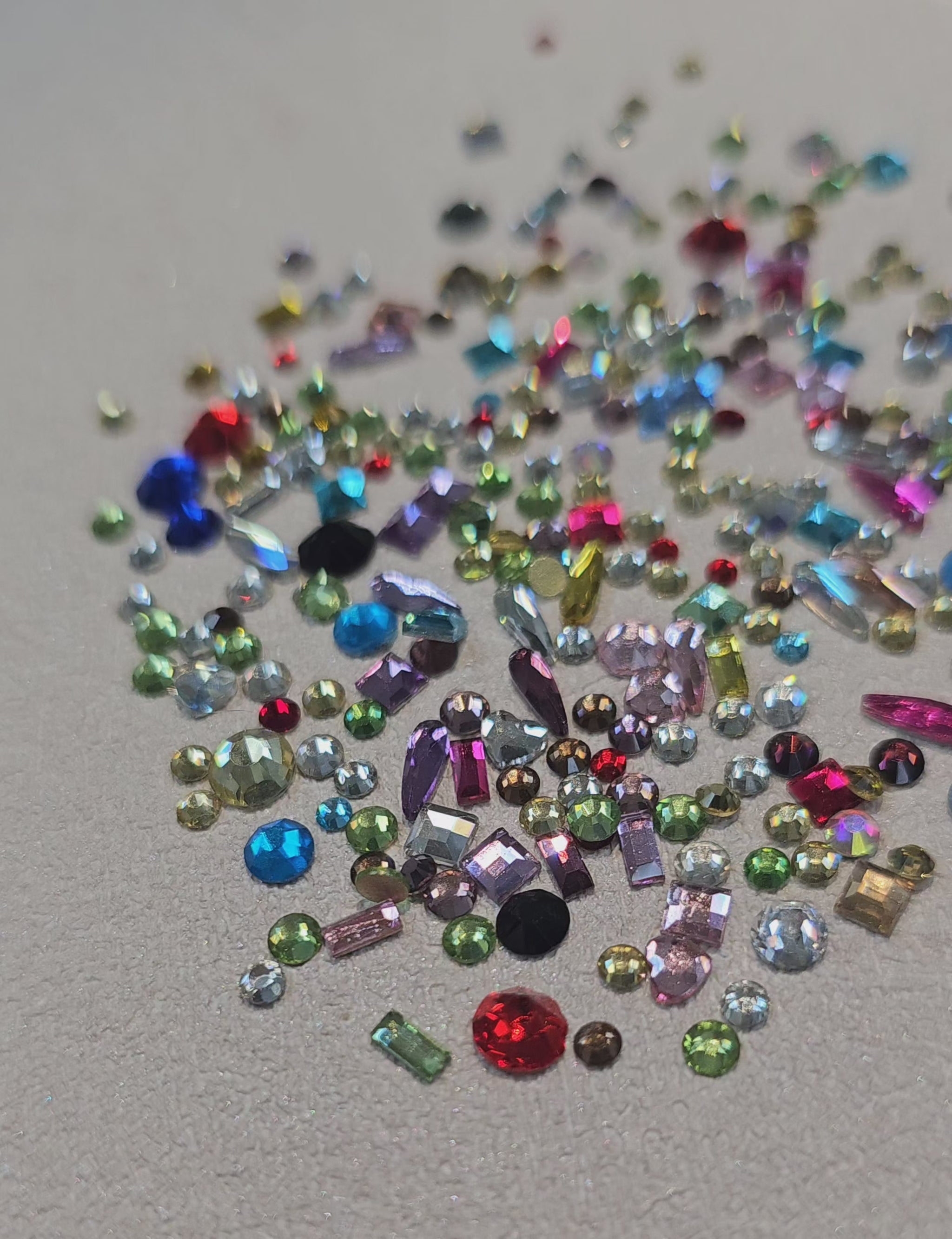 These are flatback crystals in a variety of colours, shapes and sizes, including round, raindrop, square, and heart.